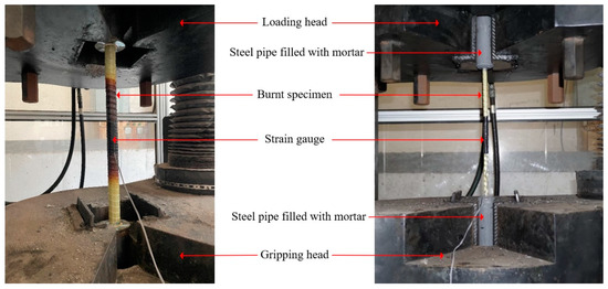 First, the anchorage zones of the specimen were firmly attached to the loading head of the loading machine in such a way that slipping during applying the tension force would not occur and the loading direction corresponding to the longitudinal axis of the rebar could be ensured. Next, the burnt rebar surface was polished until a satisfactory level of smoothness was achieved for strain gauge attachment. Finally, before applying the tensile load on the specimen, a strain gauge was attached at the mid-length of the clear range of the rebars for measuring the mechanical properties of the specimen after the fire.