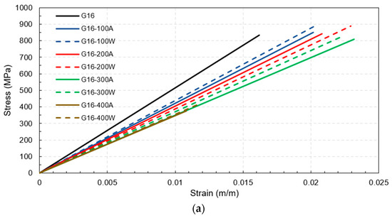 Figure 6a–c illustrate the stress–strain curves for G16, G20, and G25, respectively. Based on the test results, the stress–strain relationship of post-fire GFRP bars increased linearly from the beginning until failure. These results agreed well with Spagnuolo et al. [28], who conducted experiments to investigate the residual mechanical behavior of GFRP bars following exposure to temperature treatments ranging from 100 °C to 700 °C. Notably, their study did not specifically explore the effect of the water-cooling technique.