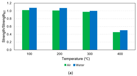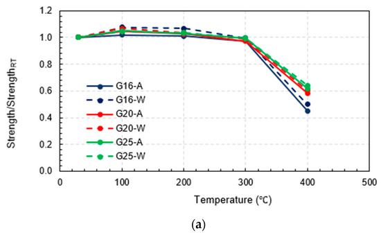 For the maximum temperature exposures of 100 °C, 200 °C, and 300 °C for all rebar sizes and cooling approaches, there was no significant change in the tensile strength compared to the tensile strength of identical-sized rebars before the fire because the maximum temperature exposures did not exceed the critical temperature of between 300 °C and 400 °C; hence, the mechanical properties after being cooled and tested had recovered. Notably, even though there were slight increments in the tensile strength after exposure to this range of elevated temperatures, these increments might have been inconsistent with the real behavior of the rebars in use because the increases may have been the consequence of better curing of the resin when there was no applied load on the fiber direction of the rebars during the fire, as demonstrated in this study [28]. On the other hand, in cases where the targeted temperature reached 400 °C, the rebars experienced severe damage when they reached the critical temperature range of 300 °C to 400 °C. This resulted in thermal degradation of the polymer and loss of load transfer among the fibers. Consequently, the mechanical properties became non-reversible. This observation is consistent with the findings of a previous study [32] which investigated the tensile, shear, and flexural properties of sand-coated GFRP bars under low temperatures (−100 °C to 0 °C) and elevated temperatures (23 °C to 315 °C). The purpose of that study was to gain insights into the thermal stability of the mechanical properties. Thus, the tensile strengths of G16, G20, and G25 decreased substantially by about 55%, 41%, and 38%, respectively, regardless of the cooling approach, as can be clearly observed from the plot of normalized tensile strength in Figure 7a. Additionally, these numbers implied that the larger the rebar in the range between 16 mm and 25 mm, the smaller the percentage of tensile strength reduction when exposed to 400 °C. It can be seen from Figure 8 that the residual tensile strengths of all rebars after cooling using water were slightly greater than those that were gradually cooled using air.
