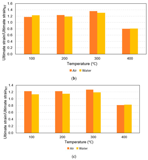 Considering the ultimate strain, it was clear that all the rebars that were exposed to 100 °C, 200 °C, and 300 °C deformed more than the same-sized rebars before the fire. In other words, rebar ductility increased due to temperature exposure between 100 °C and 300 °C. On the other hand, for maximum temperature exposures to 400 °C, the plot of the normalized ultimate strain in Figure 7b indicates that the ultimate strain of G16, G20, and G25 decreased significantly compared to the pre-fire identical size rebars by about 33%, 20%, and 18%, respectively. Similar to the effects due to the rebar size on the post-fire tensile strength reduction, after exposure to 400 °C, the larger rebars within the range 16–25 mm tended to be more ductile than the smaller rebars in the same range and the percentage of the ductility reduction was relatively lower. In addition, Figure 9 shows that the ultimate strain levels of all rebars after exposure to 400 °C followed by water cooling were more than for the air-cooled rebars, while the ultimate strain levels of the 25 mm rebars after being heated to 100 °C, 200 °C, and 300 °C before being air cooled by air were slightly more than those that were water cooled. However, there was no clear trend observed in the other specimens.