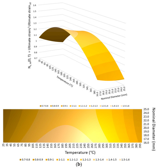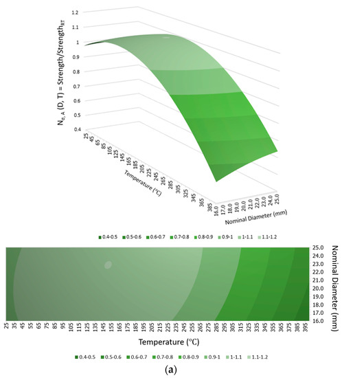 - The correlations between maximum temperature exposure, rebar nominal diameter, cooling method, and the post-fire mechanical properties were plotted, and variation models were developed by fitting the correlations with the quadratic response surface model. The adoption of this model was based on its capability to provide a reliable reference for design purposes, given its favorable shape.