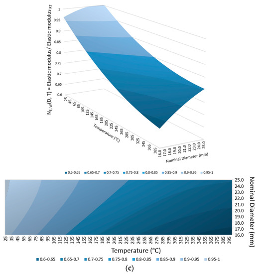 The mechanical properties of the GFRP rebars were normalized using the pre-fire properties to provide an indication of post-fire mechanical properties variation. These normalized properties, namely Ni,j where i denotes strength (σ), ultimate strain (ε), and elastic modulus (E) while j denotes the implemented cooling method (A and W for the air and water cooling method, respectively), were plotted against the maximum fire temperature exposures as well as the nominal diameters in Figure 11 and Figure 12, respectively, for air and water cooling, respectively, to show the more apparent course of the correlation between these two parameters and the dependent variables when implementing different cooling methods. After that, the variation trend was fitted with a quadratic response surface model, as shown in Equation (1):