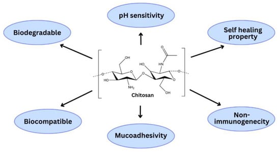 Natural polymers have received a great deal of attention for the fabrication of PNPs for the delivery of anticancer drugs due to their possession of numerous characteristics: higher biocompatibility, biodegradability, interactions with biomolecules, controlled enzyme degradation, low immunogenicity, ease of surface modification, and economics [22,23]. Amongst these natural polymers, chitosan has received the courtesy of researchers as a drug delivery system to deliver chemotherapeutic agents due to distinct characteristics like great drug loading capability, sustained circulation capacity, multifunctionality, drug release at cancerous sites in an efficient manner, removal of cytotoxicity to non-cancerous cells, auspicious targeting, and permeability of cell membranes owing to the presence of a primary amine group in their chemical structure [24,25]. Chitosan provides specific targeting to cancerous cells due to functionalization with various specific polymers such as hyaluronic acid (HA), polyethylene glycol (PEG), folic acid (FA), RGD, etc. In a study, Almutairi FM et al. prepared hyaluronic acid-decorated chitosan nanoparticles loaded with raloxifene to treat lung cancer and found that raloxifene-hyaluronic acid-chitosan (RX-HA-CS) nanoparticles exhibited greater cytotoxicity against A549 cancer cells than raloxifene-hyaluronic acid (RX-HA) nanoparticles and raloxifene-chitosan (RX-CS) nanoparticles. This noteworthy dominance of A549 cell viability was attained through glucose uptake lessening, which resulted in reduced bioenergetics of cancer cells and stimulation of apoptosis through nitric oxide level elevation [26]. In another study, Ullah et al. prepared folic acid-decorated chitosan nanoparticles embedded with 5-fluorouracil and investigated whether cytotoxic potential was improved in the presence of folic acid. The folic acid-decorated chitosan nanoparticles showed greater cytotoxicity than plain, undecorated chitosan nanoparticles in colon cancer [27]. This depicts that functionalization of chitosan nanoparticles with specific molecules improves the site-specific potential of drug molecules embedded in them. The chemical structure of chitosan and its properties as an ideal drug delivery system are depicted in Figure 2.