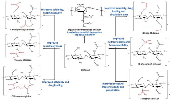 The properties of chitosan can be modified by employing physical and chemical modifications of the hydroxyl groups and free amino groups present in its structure [56]. Due to the presence of ridiculous functional groups, namely the amino group, primary hydroxyl, and secondary hydroxyl group at C-2, C-3, and C-6 positions, respectively, the parent structure of chitosan can be modified through acylation, alkylation, esterification, etc. to get modified chitosan derivatives having desirable physical, chemical, and biological characteristics, as depicted in Figure 3 [57].
