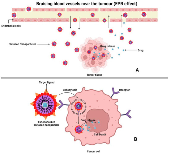 In passive drug targeting, the CSNPs are transported to the cancer site using leaky tumor capillary penetrations. The enhanced permeability and retention (EPR) effect is then used to selectively transport drug-embedded nanoparticles into cancer cells. This is crucial for the uptake of CSNPs into cancer cells, especially in rapidly developing solid tumors. The ability of CSNPs to internalize into cancer cells can be increased by up to 50 times more than it is in normal cells [77]. These high ratios result from extensive angiogenesis with vascularization, irregular blood vessel structure between endothelial cells, damaged lymphatic drainage systems, rapidly proliferating tumor tissues, the absence of a smooth muscle layer in cancer blood vessels, the slow venous return of nanoparticles from the tumor environment, and the need for a higher oxygen supply to support rapid tumor proliferation [78].