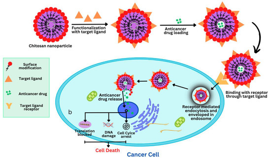 Representation of drug targeting to cancer cells employing chitosan-based nanoparticles.