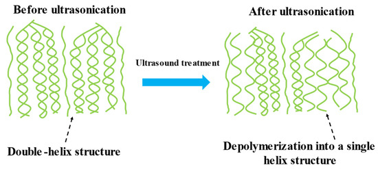 Ultrasonic modification is a processing technique that results in the physical depolymerization of starch. Ultrasound helps to improve the physicochemical properties of starch. The advantages of the process lie in the use of small amounts of chemicals and the consumption of less amount of time [48]. Satmalawati et al. varied the amplitudes and treatment durations and used eight combinations of amplitudes and treatment times to treat starch [49]. They reported that ultrasound treatment degraded starch polymers, while resulting in the generation of amorphous starch. Thus, modified starch had a higher content of amylose, low viscosity, and increased solubility of the samples. The results agree well with the results reported by Mohammad Amini et al. and Rahaman et al. [48,50]. Ultrasonic modification is an ideal modification method because it is a green method, and the modification parameters can be adjusted without restrictions. This method can be used to obtain modified starch with the desired properties. However, the effect of ultrasonic modification was unstable, and the experimental results were difficult to reproduce. In the future, we need to explore the principle of ultrasonic modification in depth to obtain the target properties of starch. The changes in the properties of starch after ultrasonic modification are shown in Figure 1.
