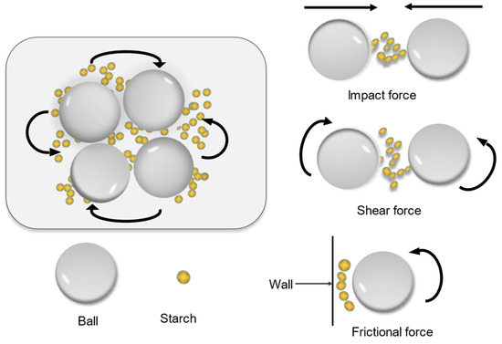 Ball milling modification involves the exploitation of friction, impact, shear, or other mechanical forces to modify the structure and properties of starch granules (Figure 3) [56]. Ball milling modification can be categorized into dry ball milling and wet ball milling methods. Wet ball milling is an energy-efficient method that can dissipate heat effectively and produce samples with small particles. This method was more efficient than the dry ball milling method [57]. The effect of ball milling treatment primarily depends on the starch source and grinding conditions (density of the grinding material, ball size, grinding speed, grinding time, ball-to-powder ratio, etc.). Huang et al. investigated the effect of ball milling on the physicochemical properties of cassava starch and corn starch and reported that the ball milling process destroyed the crystal structure of starch [58]. It was observed that the pasting temperature of starch decreased with an increase in the grinding time, the cold-water solubility increased with the breakage of hydrogen bonds, and the cold-water solubility of cassava starch was higher than that of corn starch. Ahmad et al. used a planetary ball mill (600 rpm, 5 h, 5 zirconium balls with a diameter of 8 cm) to grind water caltrop and horseshoe starch [59]. The results indicated that the water absorption capacity and thermal stability of the modified starch were better than those of natural starch, and this result was consistent with the results reported by Huang et al. and Juarez-Arellano et al. [58,60]. Han et al. investigated the effect of treatment times (0, 10, 20, 30, 40, 50, and 60 min) on the granule structure and physicochemical properties of different starch samples (wheat starch, type A and type B starch) [61]. Scanning electron microscopy (SEM) technique was used for sample analysis, and the results revealed that the degree of starch granule fragmentation realized increased with an increase in the ball milling time. In contrast, partial re-agglomeration of wheat starch granules and type B starch was realized when the samples were ball milled for a prolonged time (30, 40, or 60 min). The re-agglomeration properties of starch significantly affected the digestibility of the samples. Soe et al. investigated the effect of milling time on the properties of glutinous rice starch [56]. The results revealed that the solubility of starch significantly increased with an increase in the ball milling time, and the starch swelling capacity reached its maximum at 15 min. Moreover, the longer the ball milling time, the lower the swelling capacity, and this can be attributed to the formation of different gelling fragments and soluble substances during the process of ball milling. Ball milling and grinding are simple processes that are environmentally friendly, and the resulting product is characterized by high solubility and good dispersibility. Thus, it can be inferred that the ball milling method is a promising physical modification method.