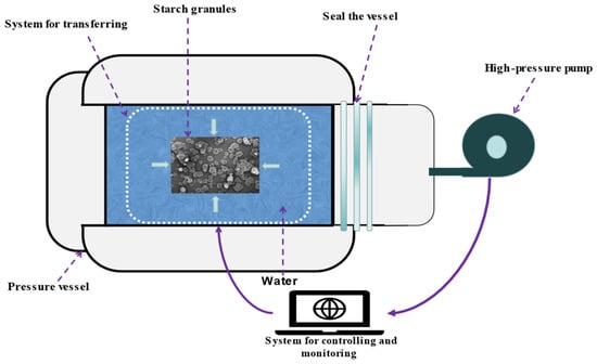 The HHP-based treatment method is a new, non-thermal, and environmentally friendly treatment technique that is easy to control [63]. This method can be used for physical modification. The mechanism of HHP action on starch is shown in Figure 4. Rahman et al. studied the effect of different parameters of HHP (HHP100, 300 and 500 MPa, 15 and 30 min at 52 °C) on the physicochemical, thermal, and structural properties of different varieties of starch samples [64]. The results revealed that the amylose and damaged starch contents of the starch samples increased following HHP treatment. However, the solubility and swelling capacity of the samples decreased, and significant differences in thermal properties between the different varieties of starch samples were observed. This can be potentially attributed to the different degrees of HHP-induced pasting [65]. However, the high hydrostatic pressure ensures that the forces acting on the product are uniform and that it is energy efficient and retains the product’s nutrients well. During food processing, starch physically interacts with fatty acids, proteins, polyphenols and other substances to form starch complexes. These complexes are useful in food technology, as they influence the texture, physicochemical properties and quality of foods. For example, the incorporation of a high amylose starch, fatty acid complex into surimi resulted in a more compact network structure of surimi gel, which improved the quality of surimi products [66]. Guo et al. prepared lotus seed starch, fatty acid complexes using high hydrostatic pressure, analyzed their physicochemical properties and found that the complexes presented a compact structure, higher crystallinity and higher thermal stability. In addition, it was demonstrated that the crystalline properties of the complexes were related to pressure and fatty acid chain length [67]. The application of HHP technology in preparation of starch–fatty acids complexes further expands the range of applications of this modification method.