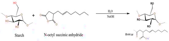 Esterification reactions can be conducted to effectively modify the structure of starch granules to improve the application prospects of starch. The skeletal structure of starch bears a large number of hydroxyl groups. Hence, starch can be esterified with acids and their derivatives [98]. Starch esters can be divided into inorganic and organic acid esters depending on the type of acid used for esterification [99]. According to the United States’ official regulations, esterified starch can be used in food products. The safety guidelines state that food items should not contain more than 3.0% octenyl succinic anhydrate (OSA)-modified starch [100,101,102]. OSA-modified starch is prepared by reacting starch with OSA, and it is one of the most important amphiphilic derivatives [100]. The reaction involves the introduction of a hydrophobic anhydride group into the starch chain to enhance the amphiphilic nature of the starch [103]. The method followed for OSA modification is the most widely used method of starch esterification because it does not require the use of toxic or hazardous organic solvents. Moreover, the desired results can be obtained under easily controllable experimental conditions [104]. The mechanism of OSA modification is shown in Figure 8. Zhang et al. investigated the effect of different degrees of substitution on the physicochemical properties of starch [105]. They used amylose as the raw material and esterified the samples with OSA at room temperature at a pH of 8.5. The results revealed that the form of the starch samples and the particle size did not change significantly post OSA modification. However, the relative crystallinity and pasting temperature of starch decreased, and the pasting viscosity, swelling capacity, and emulsion stability of the sample increased under these conditions. This result was consistent with the results reported by Zainal Abiddin et al. [106]. It was also observed that the physicochemical properties of OSA-modified starch varied based on the degree of substitution [107]. The disadvantage of OSA is its low solubility in water [107], but the improvement in swelling capacity, pasting viscosity, emulsion stability and shear resistance after OSA modification greatly expanded the application of OSA-modified starches in emulsions.