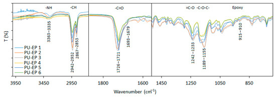 In order to investigate the chemical structure of the samples, IR spectra were taken from the PU-EPs 1–6 polyurethane-epoxy copolymers after cross-linking and solidification (Figure 2 and Figure S8) [16]. The broad absorption band with low intensity between 3363 and 3335 cm−1 belongs to the urethane –NH bands. The –CH2 vibrations appear as a double band at around 2940 and 2860 cm−1, indicating the presence of a large number of CH2 groups in these polymers. The lack of the absorption band around 2230 cm−1 supports the complete reaction of the NCO functional groups. The –C=O appears between 1726 and 1721 cm−1 in the PCD-based PU-EPs. A peak with small intensity appears as a shoulder at around 1680 cm−1, indicating the presence of the H-bonded –C=O group.
