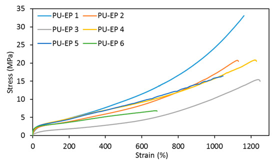 The stress–strain curves of PU-EPs 1–6 are shown in Figure 4.