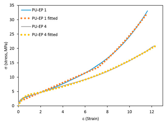 The figure shows the stress–strain (σ-ε) curves for PU-EP samples 1 and 4. The solid and dotted lines represent the experimental and fitted curves based on Equations (7) and (8). The fitted parameters for the sample PU-EP 1 are [(dε/dt)a1]−1 = 29.43, a2 = 1.68 MPa, (dε/dt)a3 = 1.44 MPa, α = 0.22 and εL = 7.1. For PU-EP 4: [(dε/dt)a1]−1 = 2.68, a2 = 0.54 MPa, (dε/dt)a3 = 3.86 MPa, α = 0.08 and εL = 0.45.