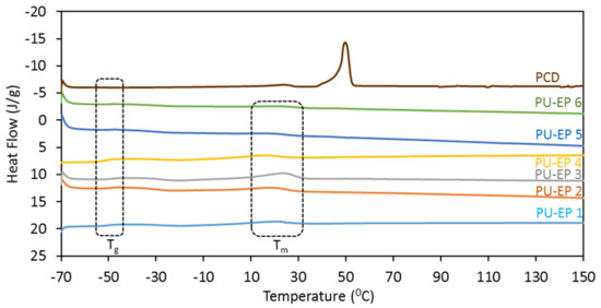 First heating DSC curves of PU-EPs 1–6 and PCD presented in the temperature range from −70 °C to 150 °C.