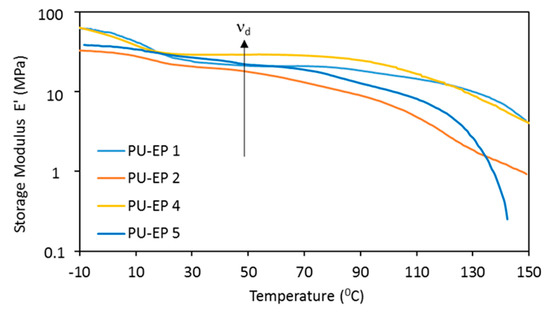 The existence of a cross-linked structure is supported further by the presence of rubbery plateaus appearing on these curves. The cross-link density in the plateau region (νd) can be calculated according to Equation (9) for samples PU-EPs 1, 2 and 4, 5 at 323 K (see Table 6).