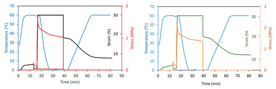 Shape memory experiments were evaluated in tensile mode using the Q800 DMA device of TA. The specimens (clamped length × width × thickness = ca. 12 mm × 7 mm × 0.5 mm) were stretched after 10 min holding at 60 °C at a strain rate of 15%/min to 30% strain, followed by quickly cooling the specimen to 0 °C. The stress was then released, and the shape fixity (Rf) was determined. Shape recovery (Rr) was measured at 0.1 N loading of the specimens (quasi-free recovery) by reheating the specimens at a 1 °C/min heating rate from 0 °C to 60 °C and holding there for 20 min. The shape fixity (Rf) and shape recovery ratios (Rr) are defined by Equations (5) and (6).