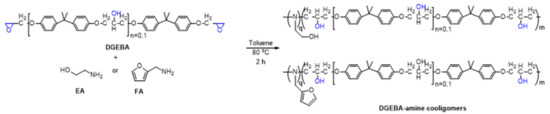 Syntheses of DGEBA-amine cooligomers (Scheme 1): 0.9 g (2.5 mmol, 1 equiv.) of DGEBA and amine (EA or FA) 0.1–0.3 equiv. was dissolved in dry toluene (5 mL) and stirred at 80 °C for 2 h under an argon atmosphere. The reaction mixture of DGEBA-amine cooligomers was investigated with MALDI-TOF MS (see Scheme 1 and Figure 1).