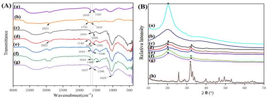 Figure 1A shows the FT-IR spectra of CS, GT and the different CS/n-HA/GT composite membranes. It can be seen that there existed vibrational peaks at 1658 cm−1 and 1597 cm−1 of CS (Figure 1Aa), which belonged to the amide I and amide II bands, respectively. Figure 1Ab represents the infrared spectrum of GT, and the absorption peaks at 2925 cm−1 and 1745 cm−1 were the stretching vibration peaks of the C-H bond and the C=O double bond in COO− of GT. Compared with the spectrum of the CS/n-HA composite membrane, 1654 cm−1 of CS in the CS/n-HA/GT composite membrane moved to a low wave number, while 1588 cm−1 moved to a high wave number, and the peak of GT at 1745 cm−1 almost disappeared, indicating that there was an ion cross-linking interaction between CS and GT, forming a poly-electrolyte complex. Comparing the ternary composite membranes with different GT contents, it was found that the CS/Sr-HA/GT(6:2:2) composite membrane had the highest deviation (Figure 1Ag), showing that the ion cross-linking effect of the composite membrane with CS/GT = 3/1 was the strongest, while the deviation of the composite membrane with CS/GT = 4/4 (Figure 1Ad) was the smallest, and there was a weak peak at 1740 cm−1, suggesting that excessive GT was not conducive to ion cross-linking. For the composite membranes after the introduction of n-HA and Sr HA (Figure 1(Ae,f)), the position and strength of the peaks were almost unchanged, indicating that the introduced nanoparticles were loaded in the poly-electrolyte of CS-GT, and the strontium-doped n-HA would not have a significant impact on the infrared spectrum of the CS/n-HA/GT composite membrane, which was consistent with the research results in the literature [32].