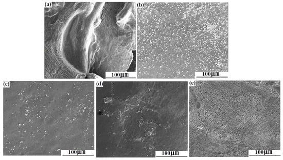 SEM micrographs of composite membrane. (a) CS/n-HA (8:2), (b) CS/n-HA/GT (4:2:4), (c) CS/n-HA/GT (5:2:3), (d) CS/Sr-n-HA/GT (4:2:4) and (e) CS/Sr-n-HA/GT (6:2:2).