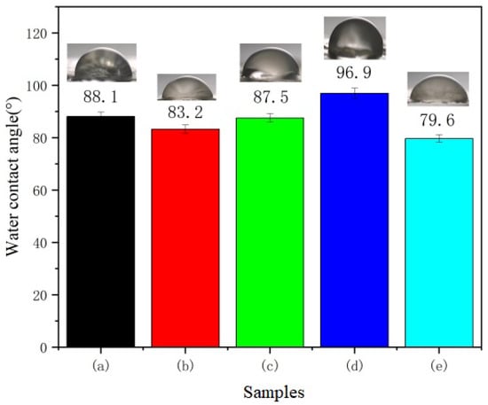 To further clarify the hydrophilicity of the CS/n-HA/GT composite membrane, the contact angle of the membranes are shown in Figure 4. As expected, it can be observed that the contact angle of the membrane would be affected by the introduction of GT and content changes. Firstly, the contact angle of the CS/n-HA composite membrane was close to 90 0 because of the hydrophobic backbone of the chitosan chain. When different proportions of GT were introduced, it was found that the contact angle of the membrane was mostly reduced, and the more GT was introduced, the stronger the hydrophilicity. This was mainly because GT itself is a natural hydrophilic polymer containing -COOH and -OH functional groups. However, the contact angle of CS/Sr-HA/GT (5:2:3) slightly increased, which might be attributed to the slight flatness (seen in Figure 2d of the SEM micrographs), which led to the roughness of the membrane surface, thus increasing the contact angle a little. For other CS/n-HA/GT membranes, the membrane surface tended to be smooth due to the cross-linking effect of GT, effectively reducing the contact angle. And the contact angle of CS/Sr-HA/GT (6:2:2) was the lowest, indicating that the strongest cross-linking effect existed there, which was consistent with the previous analysis, and the improved hydrophilicity would be conducive to cell adhesion.