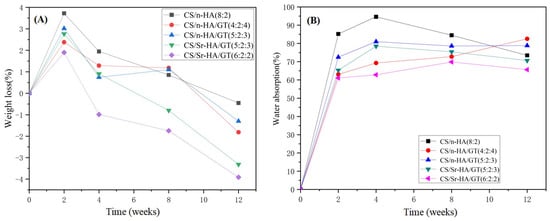 Figure 5B shows the water absorption ratios of CS/n-HA and CS/n-HA/GT composite membranes. It can be seen that (a) the CS/n-HA composite membrane had the highest water absorption ratio, especially at 2, 4 and 8 weeks, indicating that more cavities existed because of the fastest degradation. After the introduction of GT, the degradation of the CS/n-HA/GT composite membranes was delayed due to ion cross-linking with CS, resulting in a decrease in the overall water absorption ratio of the membrane. For the CS/n-HA/GT composite membranes with different GT contents, the composite membrane of CS/Sr-HA/GT(6:2:2) had the lowest water absorption ratio, which was caused by two reasons. One was that the optimum weight ratio of CS/GT(3:1) brought about the strongest ion cross-linking, which made the composite membrane have the slowest degradation and the least cavities. The other reason was that the introduction of Sr-HA produced more apatite deposition than n-HA, which would cover the cavities and decrease the water absorption ratio. However, the CS/n-HA/GT composite membrane (4:2:4) had the highest water absorption ratio, and the reason mainly originated from the weaker ion cross-linking, causing quicker degradation owing to the inappropriate weight ratio of CS/GT. Moreover, the highest amount of GT had greater water absorption because of the inherent hydrophilicity [35]. The above analysis was consistent with the weight loss ratio results.