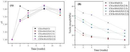 Figure 7A gives the pH value changes of CS/n-HA and CS/n-HA/GT composite membranes with time. According to the curve, within 0–2 weeks, the overall trend showed an upward trend, as the n-HA on the surface of the composite membrane dissolved and the OH- in the solution increased, resulting in a continuous increase in pH value. However, the pH value of the soaking solution in the CS/n-HA composite membrane increased remarkably due to the faster degradation and greater dissolution of HA. During 2–4 weeks, the pH of the soaking solution of the CS/n-HA composite membrane decreased, because the degradation of chitosan was mainly manifested by the breaking of the 1,4-neneneba glycosidic bond to produce a large number of hydroxyl and carboxyl groups, which led to the pH decrease. However, the pH change tended to be stable owing to the apatite deposition in the late stage of immersion. After the introduction of GT, the pH of the composite membranes remained elevated from 0 to 8 weeks, and the CS/Sr-HA/GT(6:2:2) composite membrane increased the most. This was mainly caused by the fact that the introduction of GT effectively slowed down the degradation of the CS polymers. During 8–12 weeks, the pH decreased slightly because of the weakly acidic production after the dissolution of GT and apatite deposition. Moreover, for the same weight ratio of CS/Sr-HA/GT and CS/n-HA/GT composite membranes, the Sr-HA would produce more apatite deposition, so the pH decreased more. However, the pH value of the CS/n-HA/GT composite membrane (4:2:4) was at the lowest level throughout the entire process, and the reason was that the higher content of GT generated more H+ by dissolution. Although there was a subtle difference in the pH of each sample soaking solution, the pH value of all composite membranes had a small change range of 7.40–7.63 during the degradation period, which demonstrated that there was no acid release, and it was suitable for the micro-environment in the human body, so the CS/n-HA/GT composite membranes could meet the basic requirements of harmlessness to the human body [38].