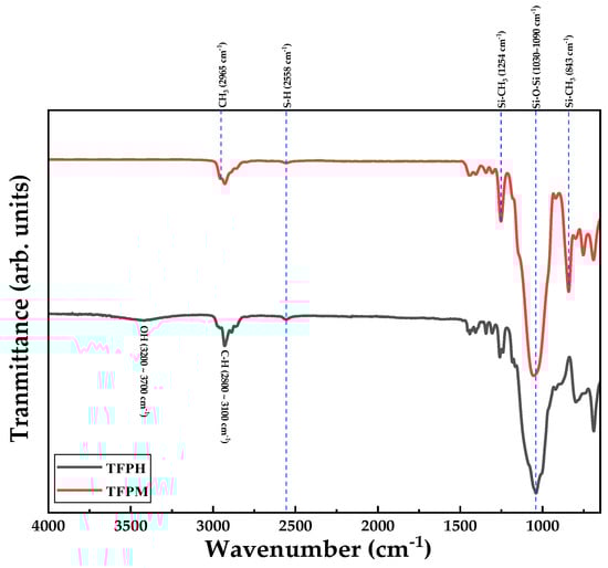 The structural analyses of TFPH and TFPM were performed using a Spectrum-400 FTIR spectrometer (Perkin Elmer, Waltham, MA, USA) with 100 scans in the wavenumber range of 650–4000 cm−1. The samples (10 μm) were dropped onto attenuated total reflectance crystals at room temperature. All spectra were adjusted by reducing CO2, removing noise, and fitting the baseline. 1H, 13C, and 29Si NMR spectra were obtained on a 300 MHz NMR instrument Avance 300 (Bruker, Billerica, MA, USA) at room temperature using CDCl3 as the solvent.