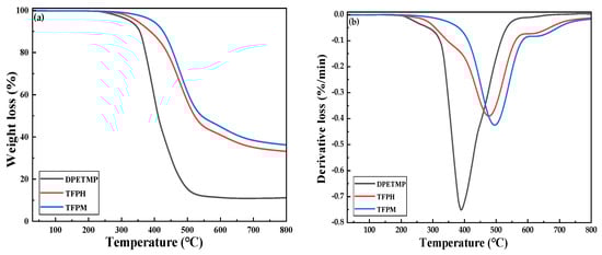(a) TGA and (b) DTG curves of DPETMP, TFPH, and TFPM.