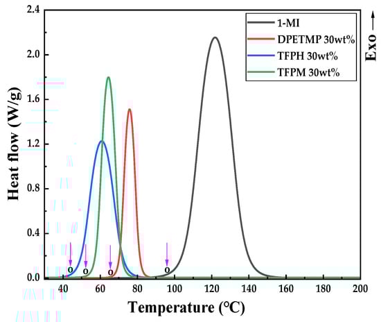 Initial temperature (TOnset), peak temperature (Tp), and heat flow for 1-MI, DPETMP, TFPH, and TFPM 30 wt%.