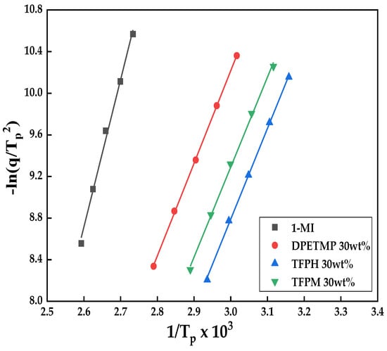 Plots of −ln(q/Tp2) vs. (1/Tp) × 103 based on the Kissinger equation for the curing of DGEBA with the 1-MI curing agent alone and in combination with various thiol-based hardeners (DPETMP, TFPH, and TFPM 30 wt%).