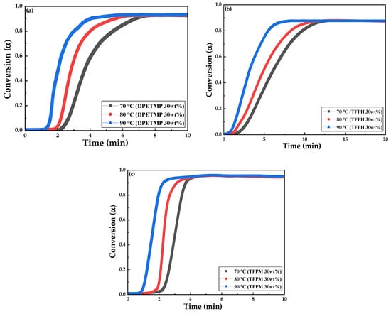 Conversion behaviors at various curing temperatures (70 °C, 80 °C, and 90 °C) along with the comparison of curing times with thiol-based hardeners: (a) DPETMP, (b) TFPH, and (c) TFPM.