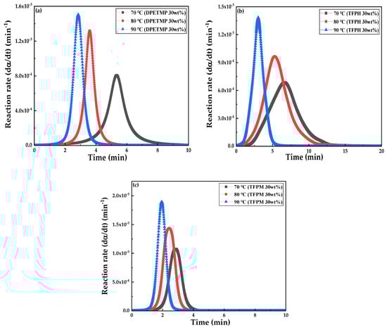 Figure 7a–c shows the change in the degree of the curing reaction of DPETMP, TFPH, and TFPM at 70 °C, 80 °C, and 90 °C with time. The area of the total calorific value was integrated over time to analyze the change in the curing degree over time. This curing reaction followed an autocatalytic reaction model, as the curing curve showed an S-shaped curve where the reaction rate was slow at the beginning of curing, rapidly accelerated, and gently slowed down at the end [].