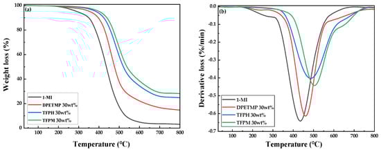 Figure 3a,b shows the decomposition curves of DPETMP, TFPH, and TFPM. The thermal safety factors of the composites were calculated from the thermogravimetric analysis (TGA) and are presented in Table 2. These factors include the following: the temperature of 5 wt% weight loss reduction (Tdec-5%), the temperature of the maximum weight loss rate (Tmax), the thermal stability indices (A*, K*), and the integral procedural decomposition temperature (IPDT).