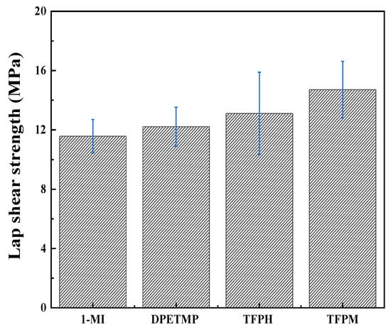 We measured the lap shear strength of samples cured with either 1-MI alone or 1-MI mixed with 30 wt% of DPETMP, TFPH, or TFPM to evaluate the impact of thiol-based hardeners on the mechanical strength of the epoxy compound. Figure 10 compares the lap shear strengths of the epoxy cured with 1-MI alone with the addition of various thiol-based hardeners. The lap shear strength increased following the order TFPM > TFPH > DPETMP > 1-MI. The epoxy compound cured with TFPM showed the highest lap shear strength of 14.71 MPa, a 20% improvement over that of the epoxy compound cured with DPETMP (12.21 MPa).