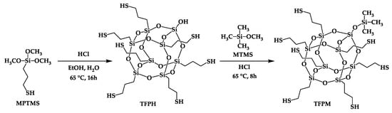 First, 6.19 g of hydrochloric acid (36.5% aqueous solution, 62 mmol) was added to the mixture of solvents (21.5 g of ethanol and 4.8 g of distilled water). Second, the mixture of monomers (3.73 g of (3-mercaptopropyl) trimethoxysilane [19 mmol]) was added to the solvent mixture. Then, the solution was heated at 65 °C for 16 h under a nitrogen atmosphere. After the reaction, methoxytrimethylsilane (0.38 g, 3.3 mmol) and 0.76 g of hydrochloric acid (36.5% aqueous solution, 8 mmol) were added, and the solution was stirred at 65 °C for another 8 h. After the reaction, the reaction mixture was poured into distilled water several times for purification. Ethyl alcohol, H2O, methyl alcohol as by-products, and impurities were removed using a rotary evaporator, and the obtained product was dried in a vacuum oven at 100 °C overnight to obtain a transparent viscous liquid. Scheme 1 shows the synthesis schemes for TFPH and TFPM.