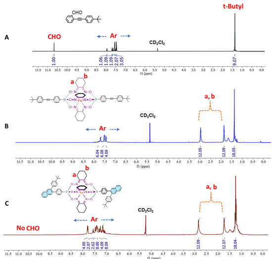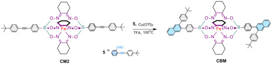 As a proof of concept, the prototypical iron(II) clathrochelate monomer CBM was prepared using the copper-catalyzed [4 + 2] cyclobenzannulation reaction conditions, where the diethynyl-containing iron(II) clathrochelate synthon CM2 was reacted with two equivalents of 2-((4-(tert-butyl)phenyl)ethynyl) benzaldehyde 5 in the presence of copper(II) triflate and trifluoracetic acid (TFA) in refluxing dichloroethane overnight, affording CBM in a quantitative yield (Scheme 2). The structure of the latter was confirmed by 1H- and 13C-nuclear magnetic resonance (NMR), ESI-MS, and FTIR spectroscopy (Figure 1 and Figures S5, S10, S14 and S18).