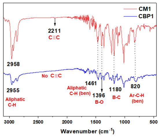 Figure 2 portrays the comparative FTIR absorption spectra for comonomer CM1 and its corresponding target copolymer CBP1. The characteristic stretching vibrations of the ethynyl (C≡C) group were detected at ~2211 cm−1 [46] for CM1, which disappeared from the spectrum of copolymer CBP1. It is noteworthy that the absorption bands identified at ~2955 cm−1 and ~1461 cm−1 correspond to the distinctive aliphatic C-H stretching and bending vibrations, respectively, which clearly indicates the presence of the butyl groups in CBP1 [47,48]. In addition, the fingerprint stretching vibrations were confirmed for each of the B-O (1396 cm−1), B-C (1180 cm−1), and aromatic C-H (820 cm−1) bending vibration peaks, which further supports the formation of target copolymer CBP1 [34,49]. Likewise, the FTIR absorption spectra of target copolymers CBP2,3 revealed their distinctive stretching and bending vibration peaks, which corroborated their successful formation (Figure 2 and Figures S19–S21).