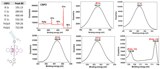X-ray photoelectron spectroscopy (XPS) survey-scan spectra of CBP1-3 confirm the presence of all of their constituting elements. The C1s, O1s, and N1s binding energies were detected in the range of ~284.8–284.7 eV, 532.2 eV, and 400.5-400.1 eV, respectively, whereas those for B1s and Fe2p were revealed in the range of 191.1–191.0 eV and 708.9-722.1 eV, respectively (Figure 3 and Figures S22 and S23) [34].