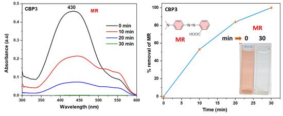 UV–VIS absorption spectra of the aqueous solution of MR in the presence of CBP3 at various time intervals (left) and plot of % removal of MR dye versus time (right, inset: chemical structure of MR and photographs showing the color change upon dye adsorption).