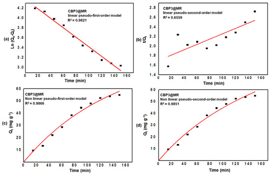 Linear and nonlinear pseudo-first- and pseudo-second-order kinetic experiments were carried out to better understand the adsorption mechanism of MR on CBP3 using an initial concentration of 500 mg L−1 of MR dye at different time intervals every 15 min, up to 150 min (Figure 7).
