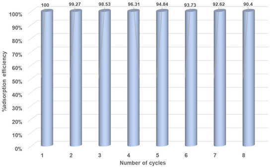 Reusability experiments were carried out in order to test the adsorbing performance of copolymer CBP3 towards MR after several adsorption–desorption cycles. Thus, a sample of CBP3 copolymer loaded with MR was ultrasonicated in deionized water for 10 min followed by its isolation through vacuum filtration over a membrane filter before adding the regenerated copolymer sample to a freshly prepared aqueous solution of MR. This procedure was repeated for several cycles, proving a removal efficiency of 90.4% for CBP3 even after eight cycles (Figure 8).