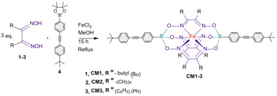Scheme 1 discloses the reaction conditions to synthesize comonomers CM1-3 from a one-pot complexation reaction [31,34] of iron(II) chloride (FeCl2, 0.44 eq.) with a dioxime derivative 1-3 (1.35 eq.) in refluxing methanol overnight and in the presence of the diboronic acid pinacol ester capping reagent 4 (1.0 eq.), thus affording the desired building blocks in excellent yields. The structures of the desired comonomers CM1-3 were confirmed by 1H- and 13C-nuclear magnetic resonance (NMR), electrospray ionization mass spectra (ESI-MS), CHN analysis, and FTIR spectroscopy (Figures S2–S4, S7–S9, S12 and S13 and Table S2).