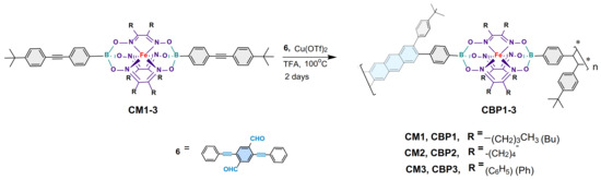 Synthesis of the target copolymers CBP1-3 (Scheme 3) was carried out using reaction conditions similar to those employed to make the prototypical monomer CBM described in Scheme 2. The copper-catalyzed [4 + 2] cyclobenzannulation reaction of the diethynyl iron(II) clathrochelate derivatives CM1-3 and 2,5-bis(phenylethynyl)terephthalaldehyde 6 afforded the target copolymers CBP1-3 in excellent yields in the range of 83–95% (Scheme 3). Table 1 summarizes the attempts carried out to optimize the copolymerization reaction conditions: when a 2.5 × 10−2 M solution of 2,5-bis(phenylethynyl)terephthalaldehyde 6 and an equimolar amount of CM1 are reacted in refluxing dichloroethane (DCE) in the presence of Cu(OTf)2 and TFA for 48 h, and CBP1 was isolated as an insoluble solid in 48% yield (Table 1, entry 1). Thus, to improve the reaction yield, the concentration of comonomers CM1 and 6 was diluted to a molar concentration of 1.25 × 10−2 M, which afforded CBP1 in 65% (Table 1, entry 2). Further dilution of the comonomers to a concentration of 6 × 10−3 M resulted in the improvement of the reaction yield, affording CBP1 in 83% (Table 1, entry 3).
