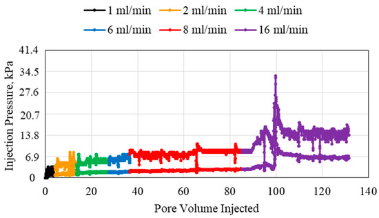The results for the polymer injection using 0.1 wt% polymer, 1.59 mm (1/16th inch) tube, and 1, 2, 4, 6, 8, and 16 mL/min flowrates are shown in Figure 2. Increasing the injection flowrate resulted in two significant observations. A larger pore volume of the polymer was needed to ensure that pressure was stable when the flowrate was higher. This indicates that using a high flowrate may require a large volume of polymer. At the higher flowrates, 16 mL/min, more abnormalities in flow behavior were observed. For example, for the 16 mL/min injection flowrate, a sudden increase in injection pressure occurred. This is due to the dehydration of some of the injected polymer under higher pressure gradients. This resulted in the polymers becoming solid-like which makes their injectivity much more difficult. Also, increasing the flowrate will increase the overall volume of the polymer flowing through the porous media. This creates a competitive flow which results in an increase in pressure. Another major observation is that at higher flowrates, the polymer-injected pore volume needed for the injection pressure to stabilize was higher. This is due to the turbulence created at higher rates.