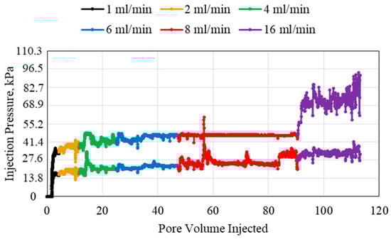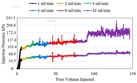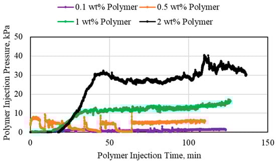 The highest polymer concentration used in this study was 2 wt% polymer, as shown in Figure 5. The pressures recorded for this polymer injection were the highest observed in all experiments. The main observation from the 2 wt% polymer experiment is that the highest flowrate required an extremely large injection pore volume in order to be able to decisively observe an average stable pressure. There are also several sudden increases in pressure for all the injection flowrates, which may indicate difficulty in injection or turbulence or slight air pockets in the polymer solution.