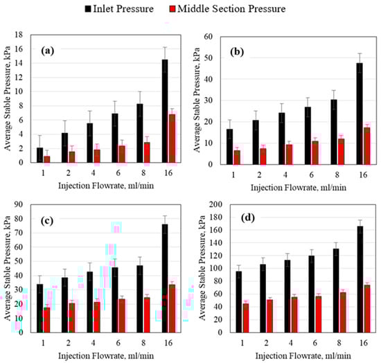 HPAM average stable injection pressure using a 1.59 mm (1/16th inch) tube ID for (a) 0.1 wt% HPAM, (b) 0.5 wt% HPAM, (c) 1 wt% HPAM, and (d) 2 wt% HPAM.