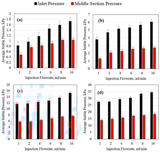 HPAM average stable injection pressure using a 3.175 mm (1/8th inch) tube ID for (a) 0.1 wt% HPAM, (b) 0.5 wt% HPAM, (c) 1 wt% HPAM, and (d) 2 wt% HPAM.