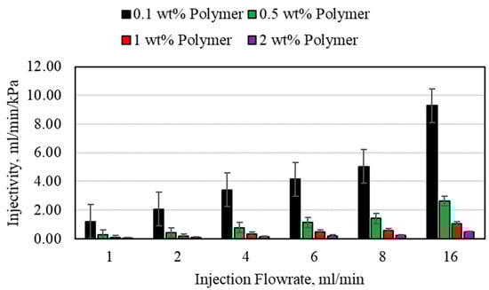 The injectivity results for the HPAM polymer using different polymer concentrations and different injection flowrates in the 3.175 mm (1/8th inch) tube are shown in Figure 11. Increasing the injection flowrate for all the polymers resulted in an increase in injectivity. The main problem with increasing injection flowrate is the increase in pressure as well, as was shown previously. If the pressure exceeds the formation fracture pressure, complications may arise downhole. As the polymer concentration increases, the injectivity decreased significantly as well. For example, the 2 wt% polymer injectivity could not exceed 3.2 mL/min/psi, which is lower than the lowest value obtained using the 0.1 wt% polymer, 8.33 mL/min/psi. For all values, the injectivity in the larger-diameter porous media was much higher compared to the smaller porous media. This will also reflect on the polymer degradation and reinjection significantly.