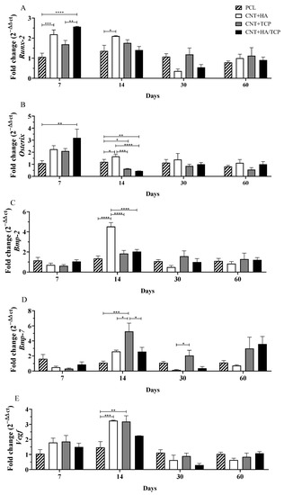 The CNT+HA/TCP group presented significantly higher Osterix expressions compared to PCL (3-fold change) at day 7 (Figure 1B). The CNT+HA and CNT+TCP groups presented a 2-fold higher expression than PCL. On the 14th day, the CNT+HA group presented significantly higher expression compared to all groups. The CNT+TCP and CNT+HA/TCP groups showed reduced expression compared to the PCL group. After day 30 and 60, no significant difference was observed among the groups, with overall reduced expression.