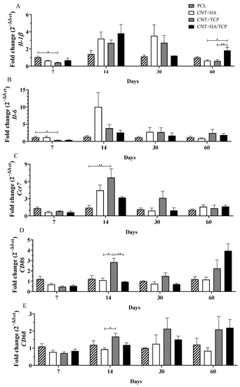 Inflammatory gene expression (qPCR) showing the fold change for (A) Il-1β, (B) Il-6, (C) Ccr7, (D) CD86, and (E) CD68 at days 7, 14, 30, and 60 in PCL, CNT+HA, CNT+TCP, and CNT+HA/TCP. * p < 0.05, ** p < 0.01.